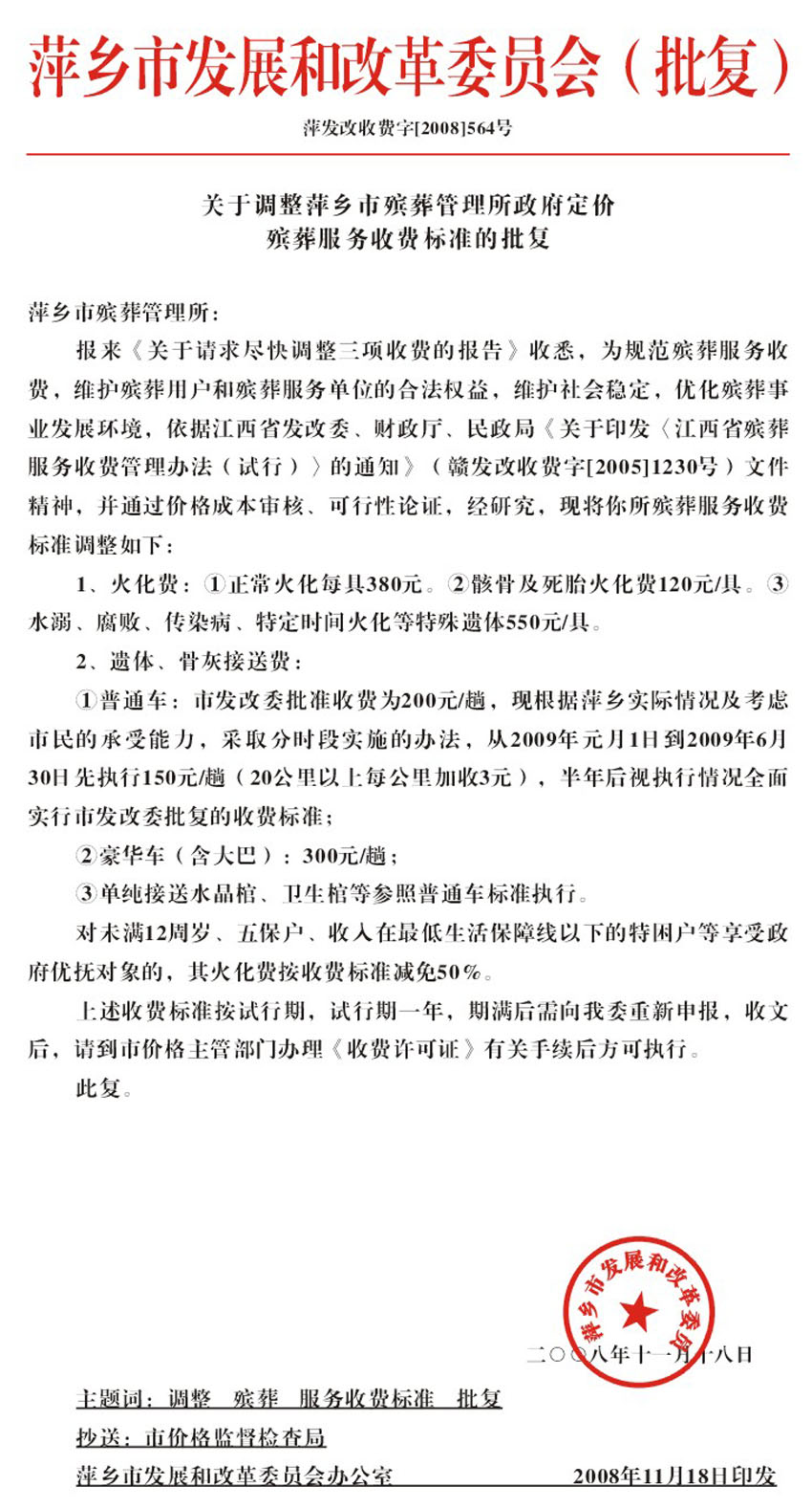 关于调整萍乡市殡葬管理所政府定价殡葬服务收费标准的批复